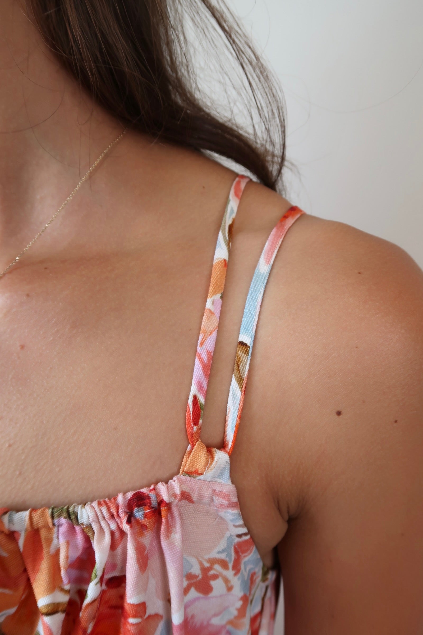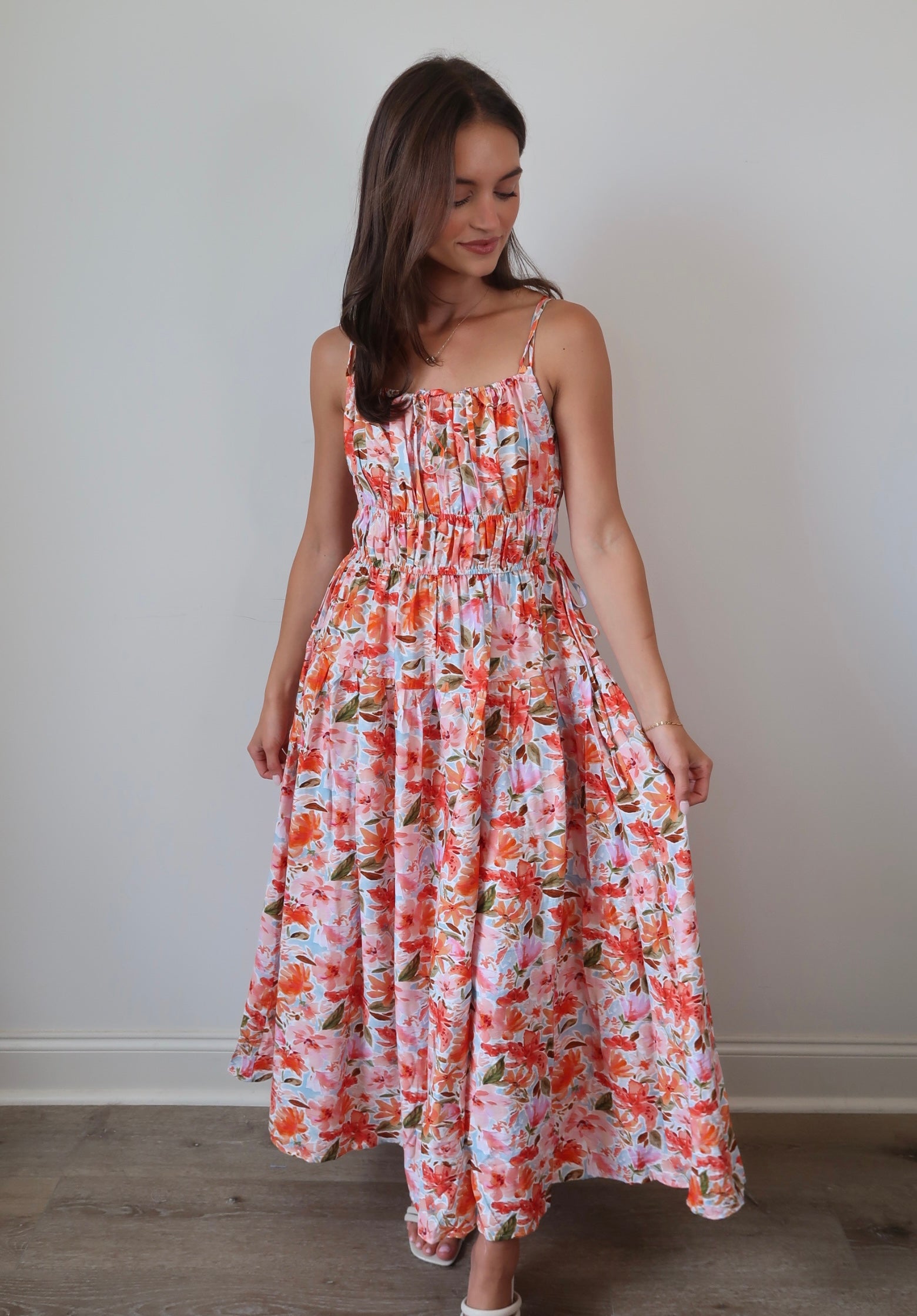 Indulge in the dreamy allure of our A Dream Come True Midi Dress. This stunning summer dress boasts a bright floral print that radiates vibrancy and beauty. The self adjusting ties on the side of the bodice ensure the perfect fit for optimum comfort. A truly gorgeous addition to your wardrobe.