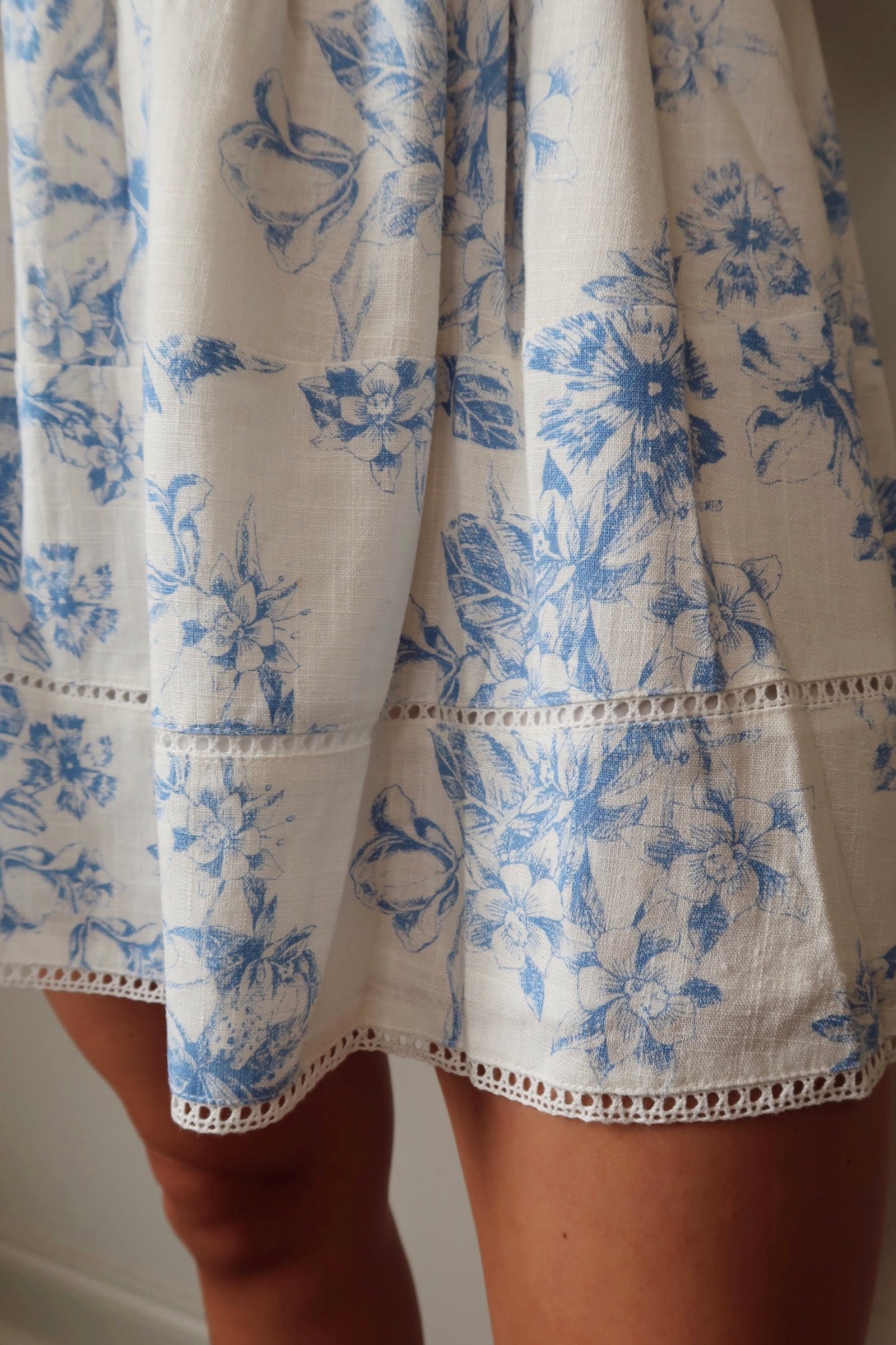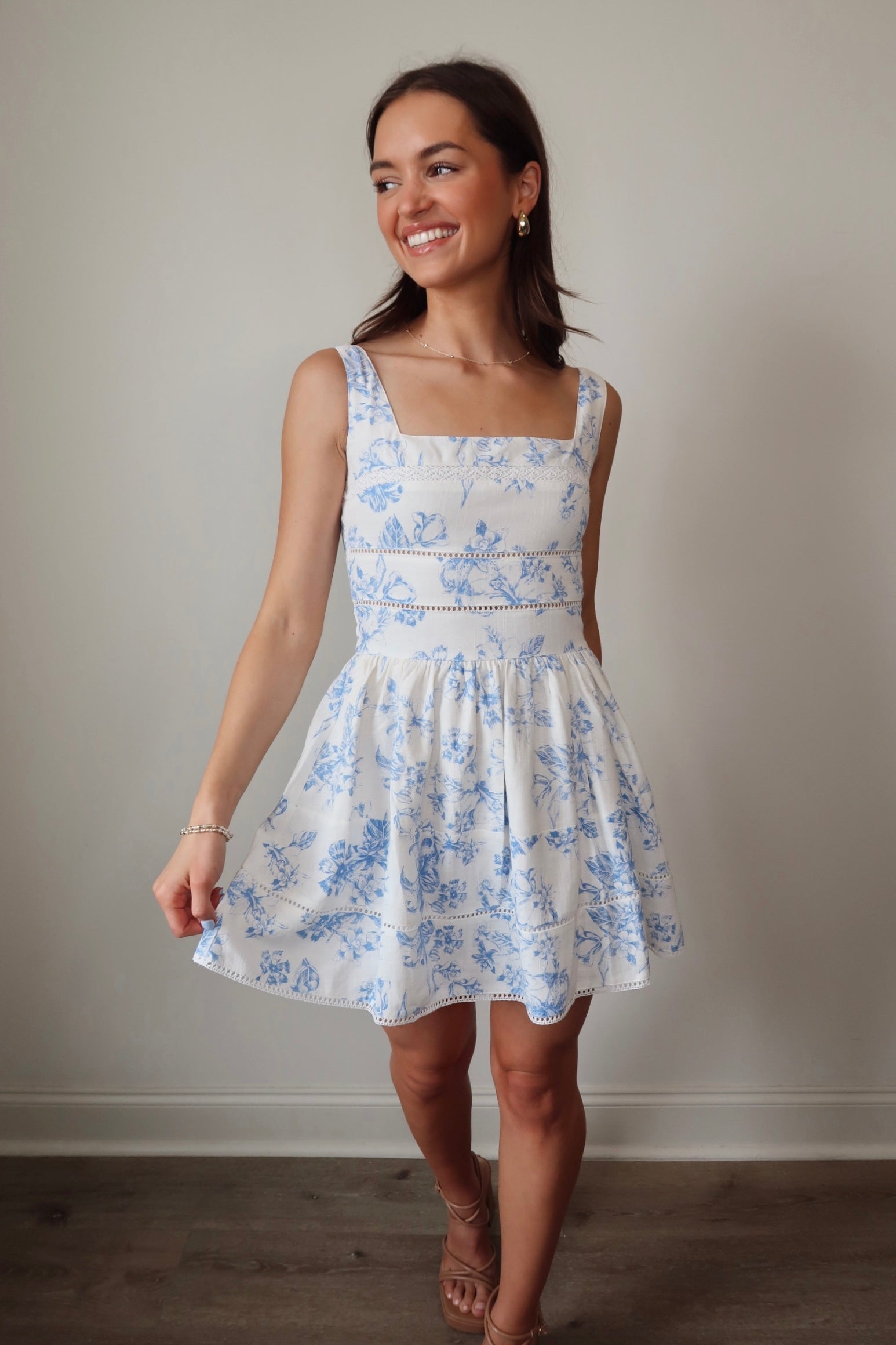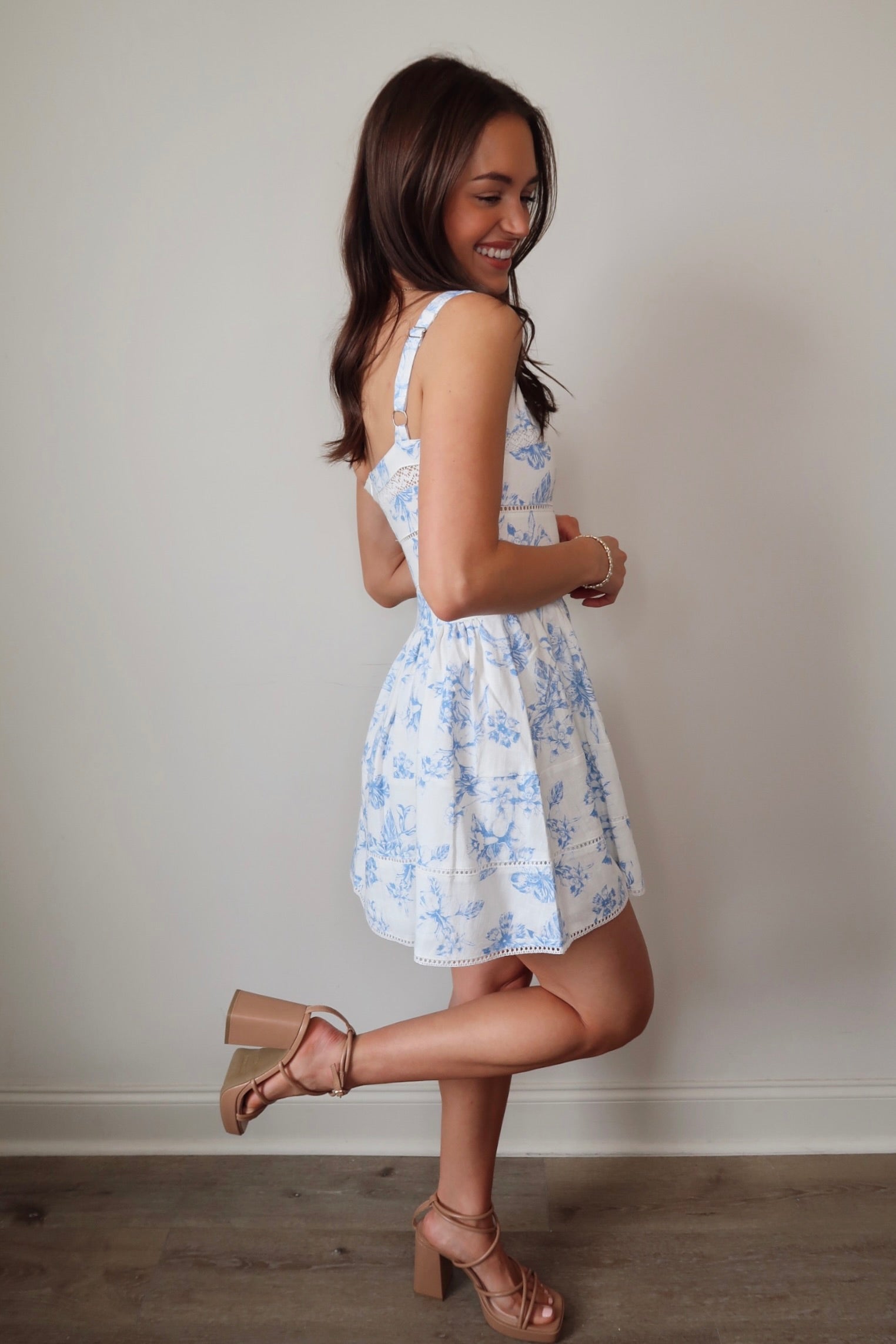 Experience a sense of carefree elegance in our Stuck On You Mini Dress. This blue floral dress features delicate lace trim and adjustable straps for the perfect fit. Add a touch of whimsy to any occasion with this beautiful mini dress.