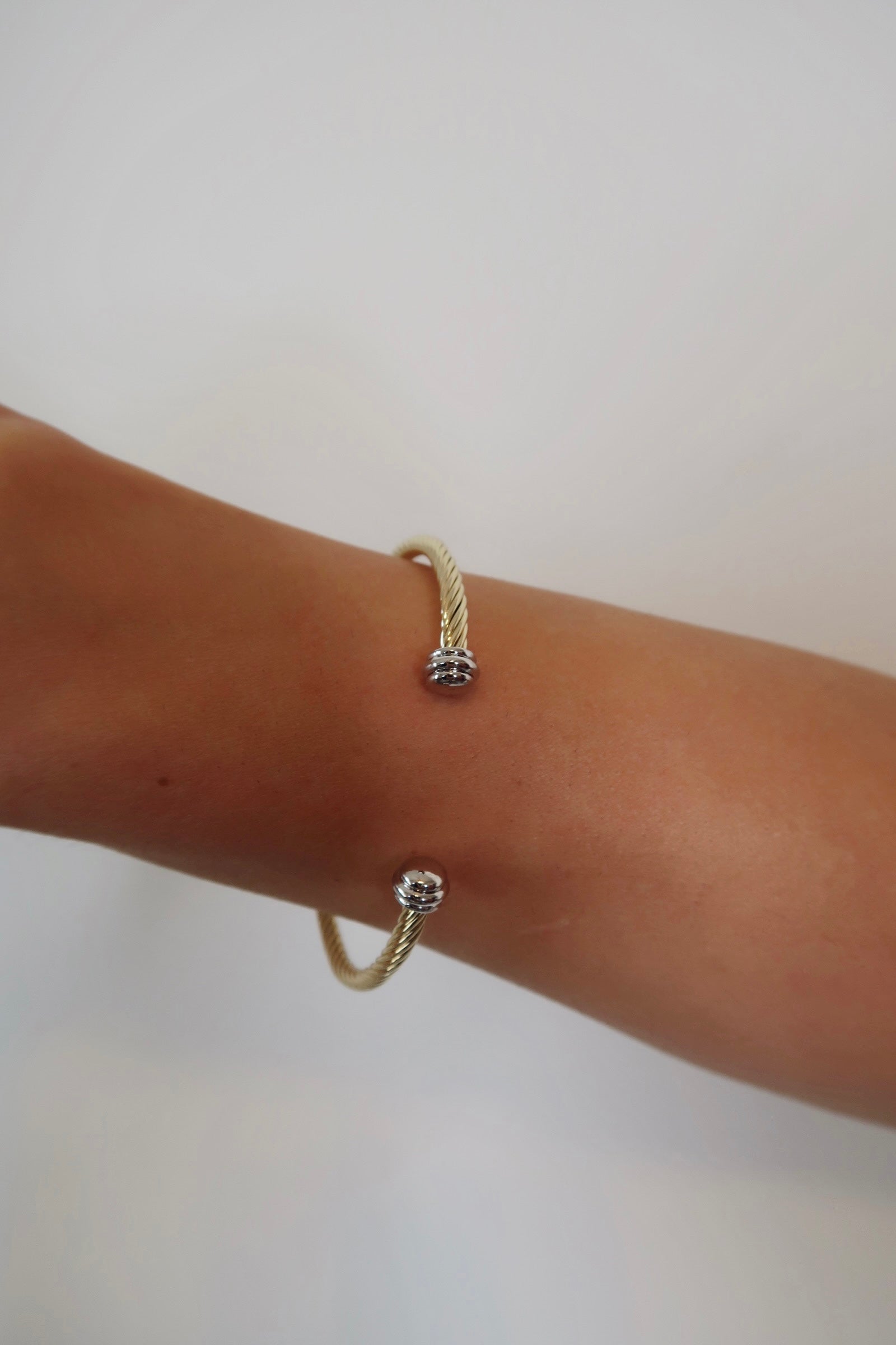 Stack up your style with this statement cuff made of mixed metals. Its thin and elegant design gives a touch of class, while the fun gold and silver features add a playful twist. Stack it with other bracelets or let it shine on its own.