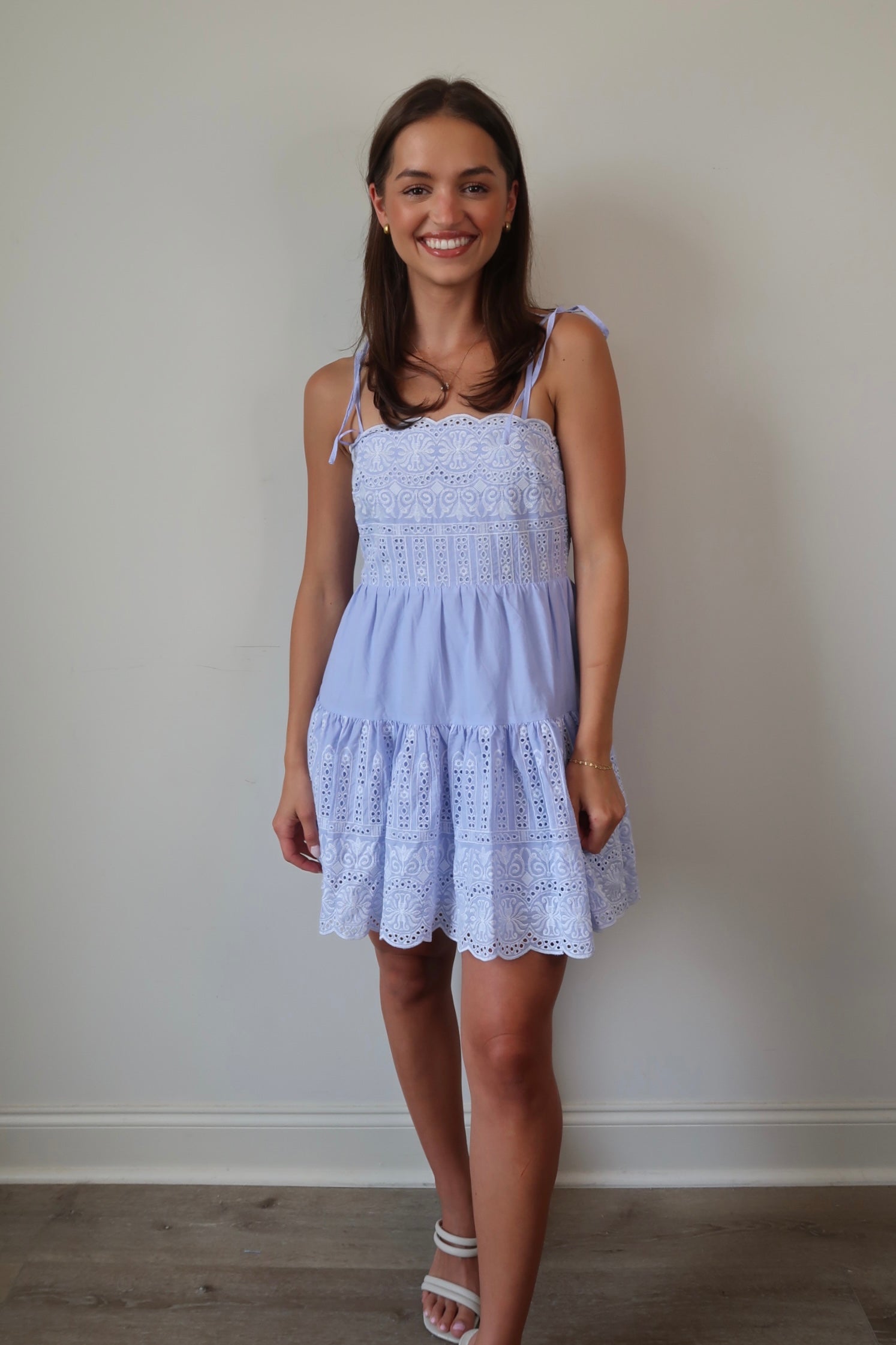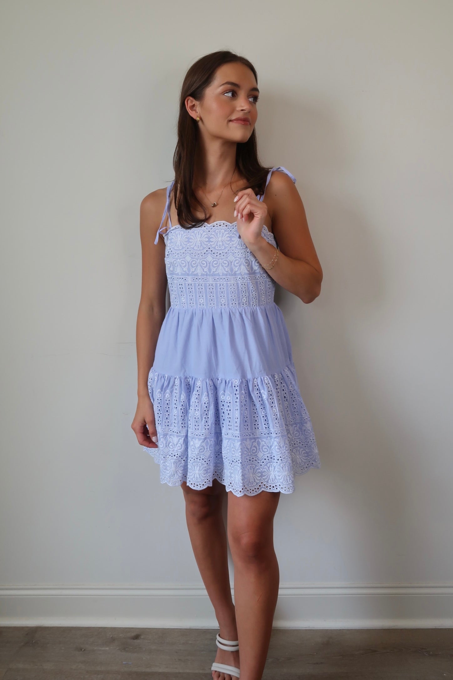 Get ready to turn heads in our Take Me For a Spin Mini Dress! This stunning dress features intricate eyelet detailing, delicate self tie straps, and a hidden zipper closure for a flawless fit. Feel confident and stylish all day!